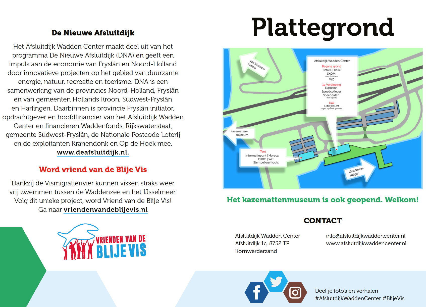 Tijdens de boottochten en in verschillende speedcolleges wordt stilgestaan bij de Vismigratierivier. Sinds de aanleg van de Afsluitdijk kunnen trekvissen niet langer ongehinderd heen en weer reizen tussen Waddenzee, IJsselmeer en achterland. De Vismigratierivier biedt vanaf 2021 een permanente opening zonder dat er een druppel zout water in het zoete IJsselmeer belandt. Projectleider Erik Bruins Slot van de provincie Fryslân vertelt hoe wat begon als droom, werkelijkheid werd. Voor jeugdige bezoekers is er de speurtocht ‘Op zoek naar de Blije Vis’. Laat je ingevulde stempelkaart zien en ontvang een vissenmasker!