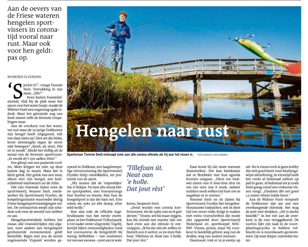 ,,Oeral wurdst mei corona konfrontearre. Set de radio oan en it giet deroer.’’ Vissen, wil hij maar zeggen, kan bij uitstek een manier zijn om heel even aan die ellende te ontsnappen. ,,Ik ha dat sels ek: eefkes allinnich oan it wetter, as yn myn fiskboat. Tillefoan út. Neat oan ’e holle. Dat jout rêst.’’