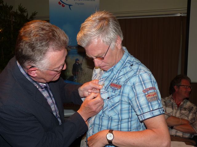 • Dhr Siebe Huizenga kreeg de gouden erespeld opgespeld door voorzitter Sake van der Meer voor zijn 25-jarig voorzitterschap van Hengelsportvereniging Voorwaarts, Drachten (meer dan 3000 leden).