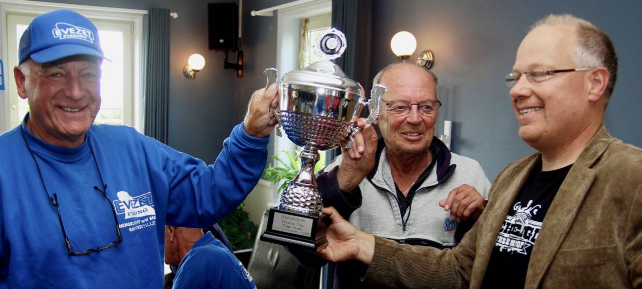Na afloop van de wedstrijd vertrokken de deelnemers naar ‘Slachtehiem’ te Lollum waar Pieter de Vries (bestuurslid Ons Genoegen, raadslid gemeente Fryske Marren en kandidaat voor Water Natuurlijk namens de hengelsport bij de komende Wetterskip verkiezingen) de Fryslân Cup uitreikte aan de nestors van hsv de Rietvoorn Klaas Kooistra en Rinze Popma (zie foto boven).