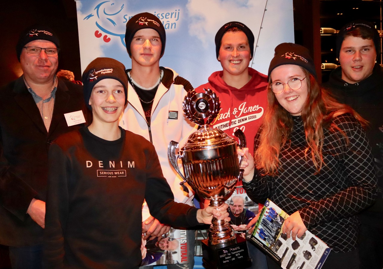 Natuurlijk was er ook aandacht voor de ‘skitterende’ prestaties van ons Team Fryslân. Het gehele Team met aanhang (14 personen) was aanwezig en werden kort bevraagd door de voorzitter waarna de 5 Teamleden en hun coach de nieuwe ‘Sv Frl Muts’ werd uitgereikt en zij tevens een jaarabonnement ontvingen van WitvisTotaal.