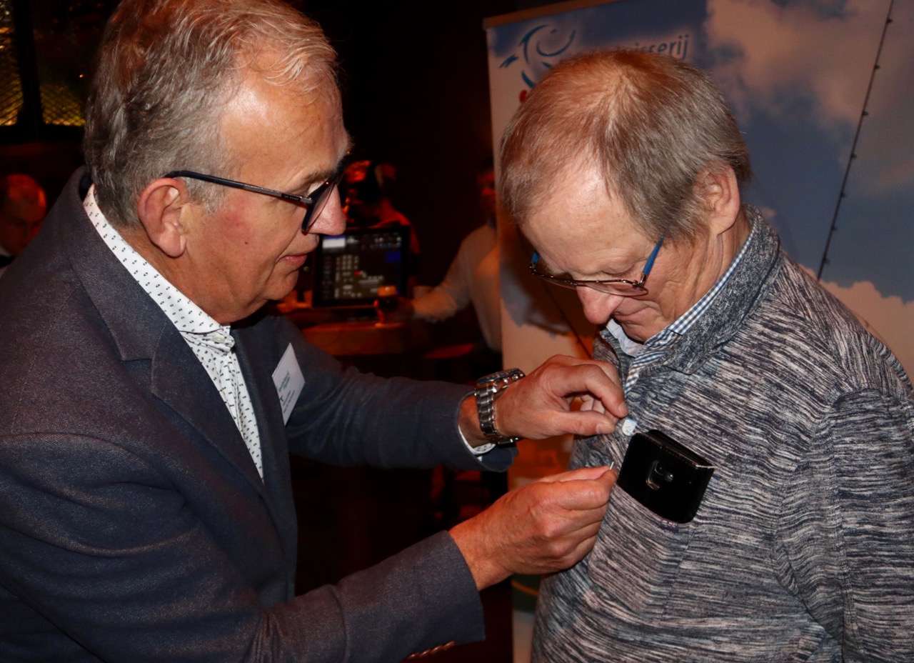 Op de foto wordt het speldje opgeprikt door voorzitter Harrie Holtman, waarna de heren nog even poseren voor de fotograaf.