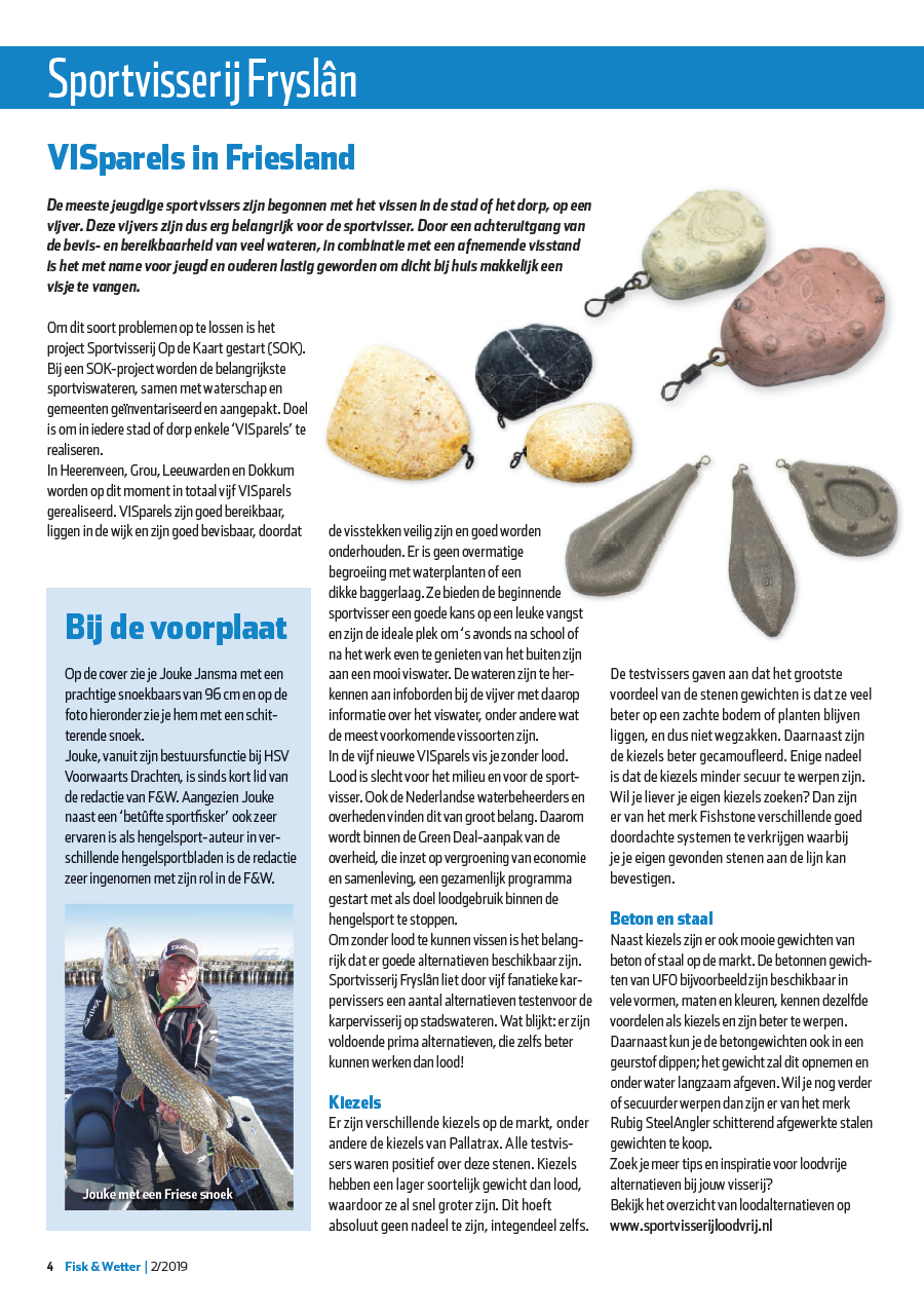 Zo staat er een uitgebreid verslag in over de ‘ Visparels in Friesland’. Een informatief artikel over met name het project ‘Sportvisserij op de kaart’ en het ‘Loodvrij vissen’.