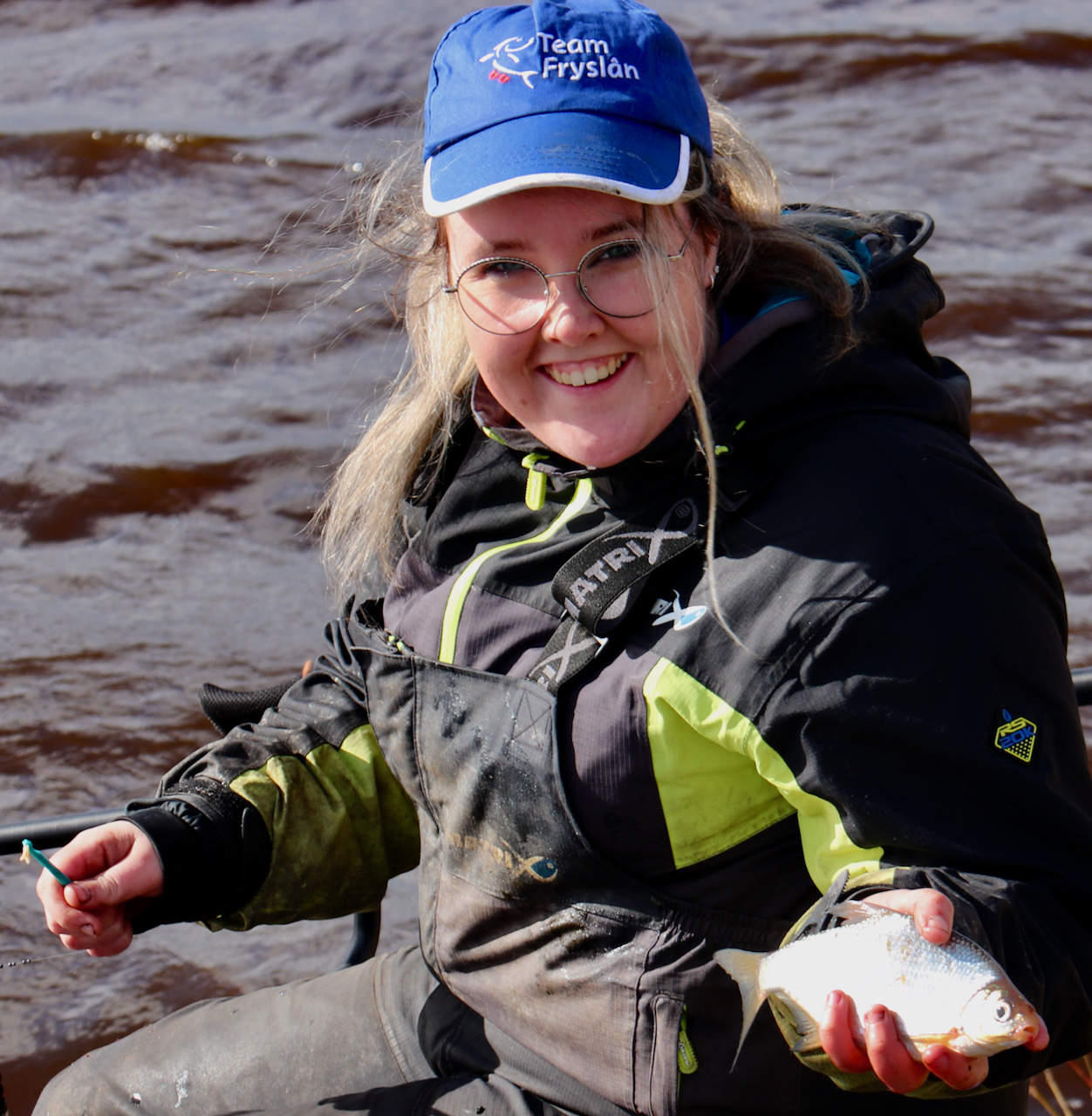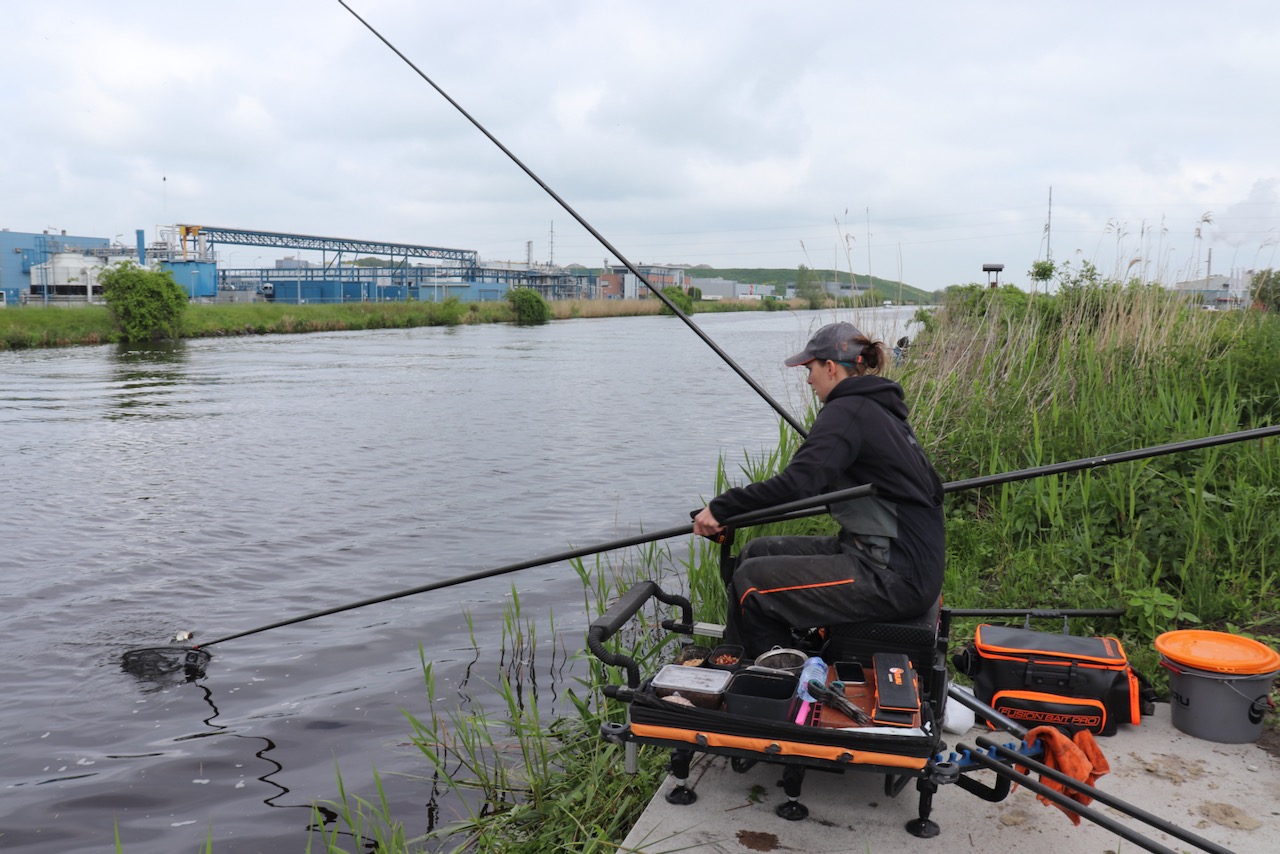 Op de foto hieronder zie je Anja Groot, Wereldkampioen Dames, die vist vanaf een van de vissteigers. De steigers liggen er prachtig bij en de visvangst in het Heerenveens Kanaal is altijd ‘bêst genôch’.