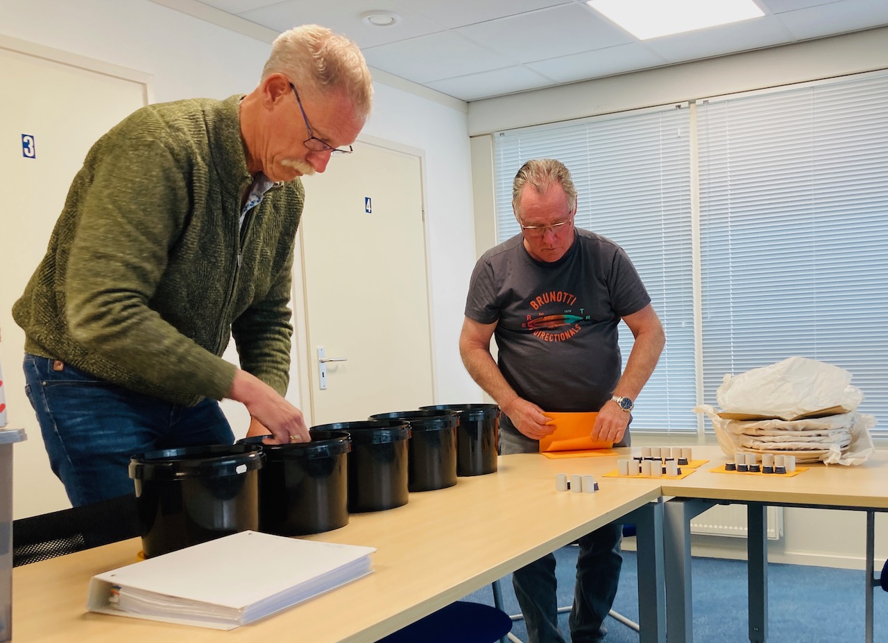 Wedstrijdleider Rene Seefat en zijn naaste assistent Hans Vijgeboom verrichten de voorbereidingen voor