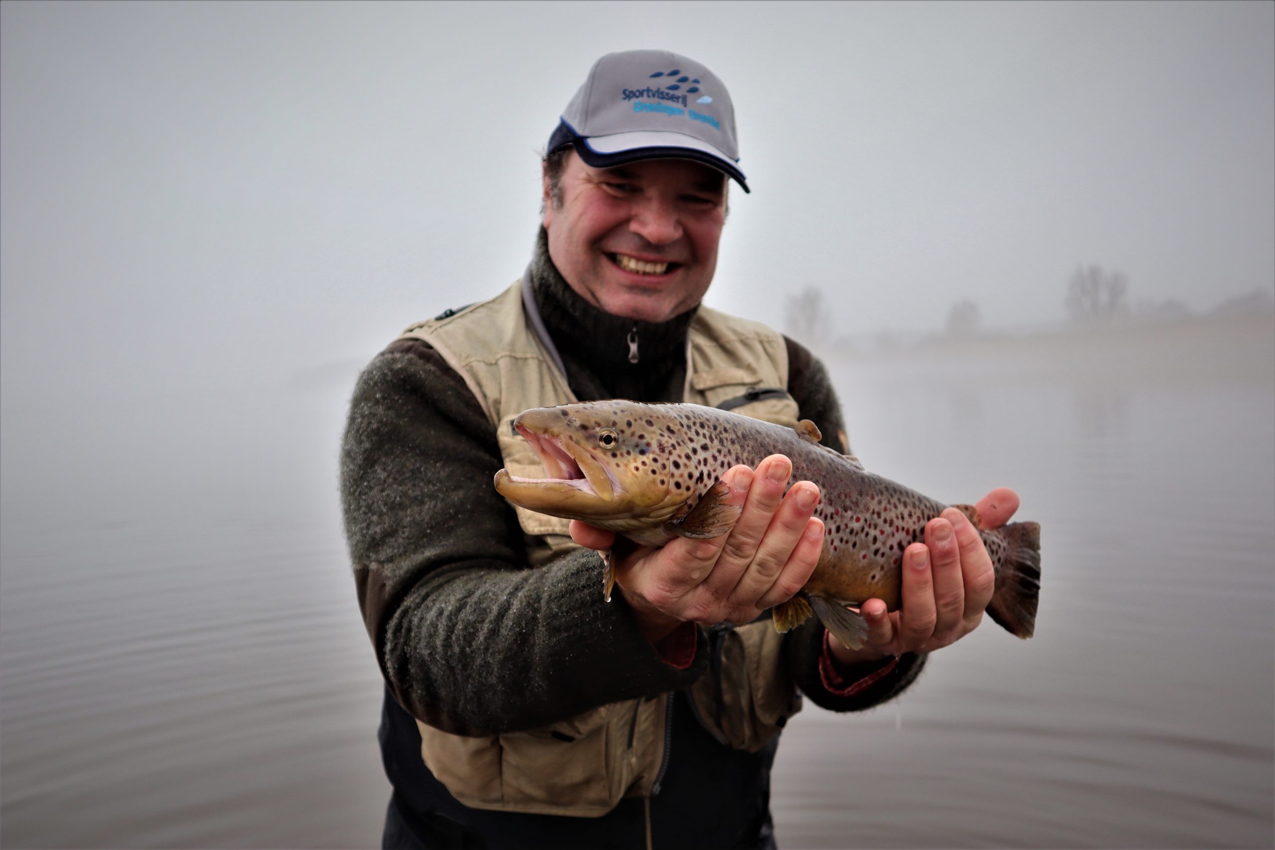 Foto; Henk Mensinga (Sportvisserij Groningen Drenthe) met een forel