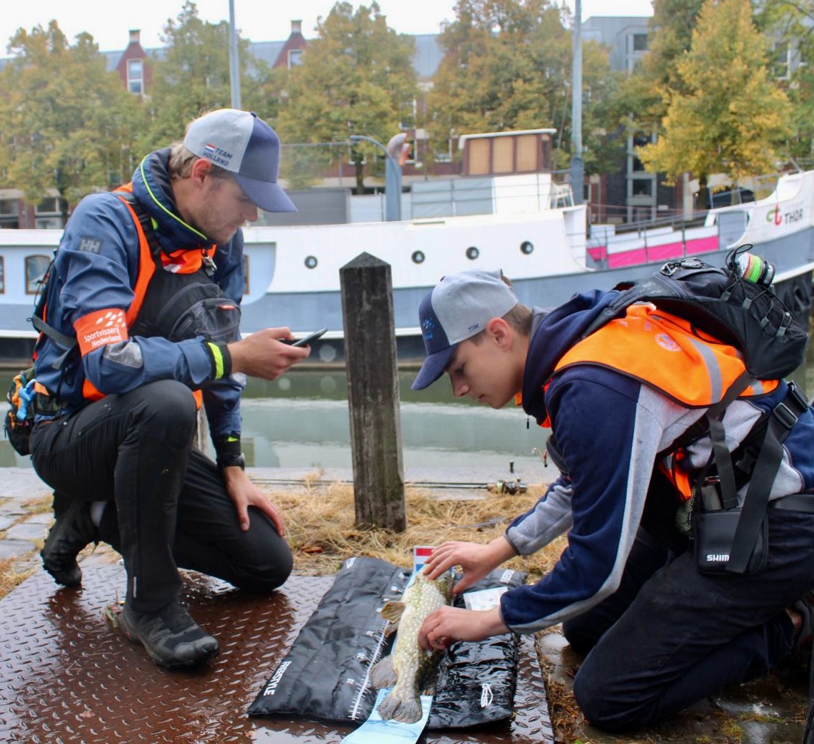 Foto 2 : Gerben en Tim meten de snoek op de meetlat en verplichte onthaakmat en plaatsen deze in de Scoring App