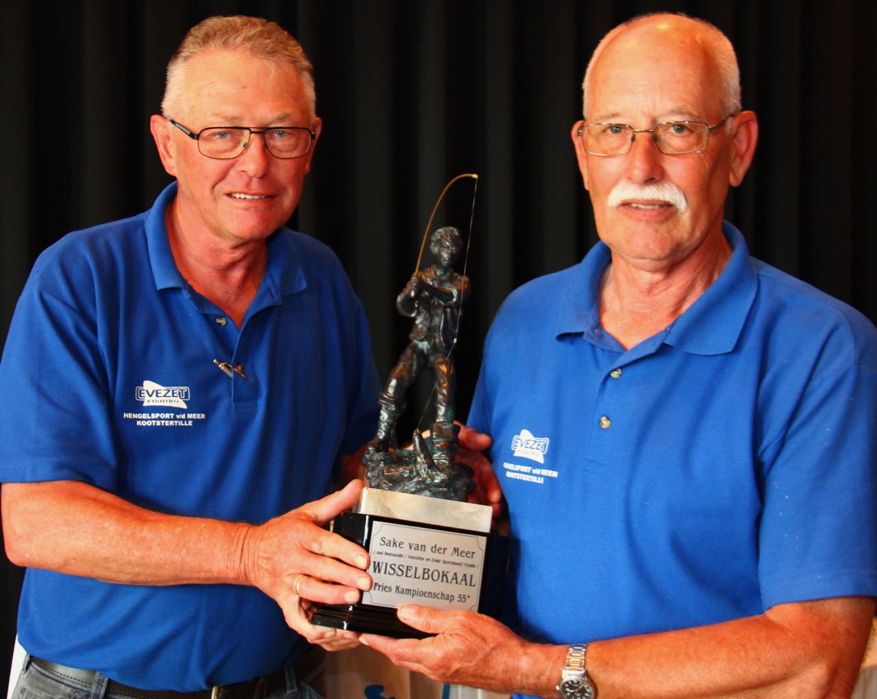 Op de foto overhandigd Sake van der Meer (links) de bokaal aan Harm Bekkema.