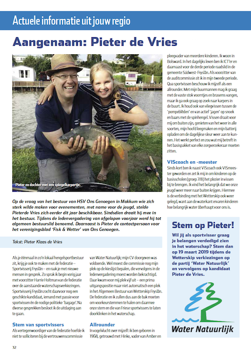 Zo stelt onze Wetterskip kandidaat Pieter Klaas de Vries zich voor, evenals onze nieuwe medewerker Jarno en onze Wedstrijdcoach Klaas. Daarnaast is er een mooi sfeerverslag over de monitoring van de Friese Boezem en een impressie van de vislessen die aan meer dan 400 kinderen zijn gegeven in het Woudagemaal te Lemmer.