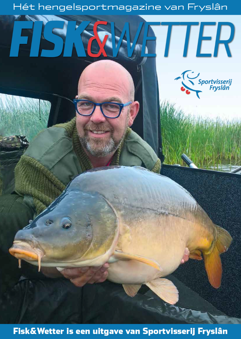 De cover van ‘Fisk&Wetter’: Folkert Reitsma met een pracht van een spiegelkarper van 13 kg uit de Friese boezem.