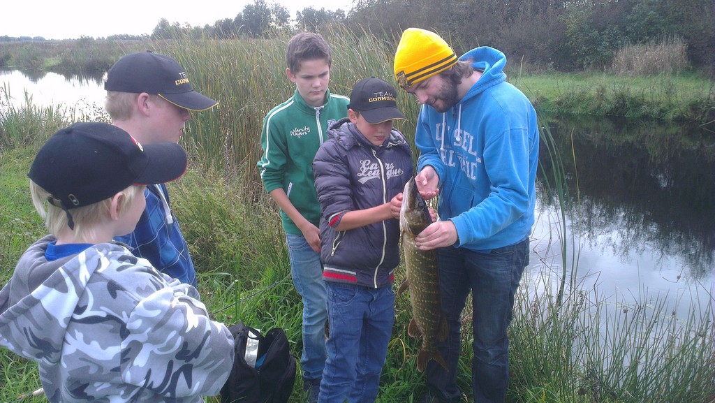 Van 12.00 tot 13.00 hadden we een pauze waarbij we heerlijke soep konden nuttigen met een broodje. Even op krachten komen en de taal spreken die maar zo’n selecte groep uit Nederland spreken kan; Latijn, Visserslatijn! Met wat warms in de maag, konden we na de groepsfoto snel weer vissen. De mist was ondertussen weg getrokken en via moderne technieken kregen we onderling door dat er nu toch wat meer snoeken werden gevangen. De tijd ging weer (te) snel voorbij en voor we het wisten waren de kinderen alweer richting thuis.