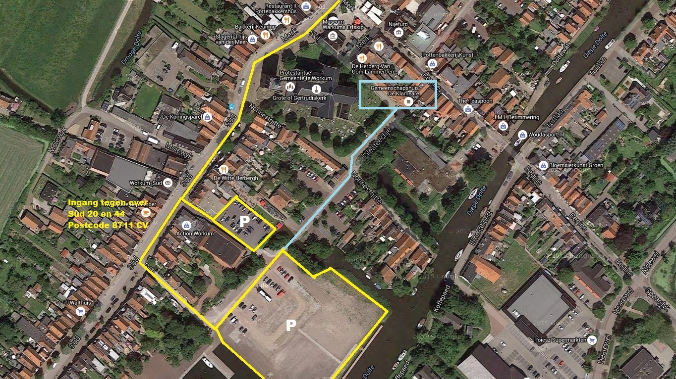 Om een en ander goed te laten verlopen ziet u hier een kaartje waarop de parkeergelegenheden en de Klameare zijn aangegeven.