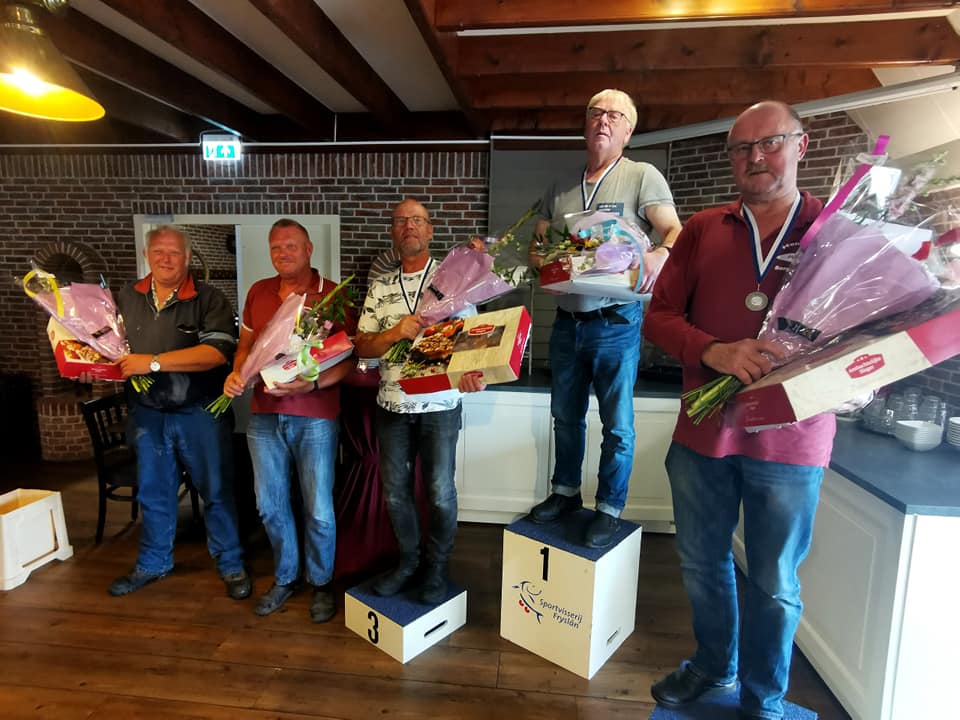 Na vier uur vissen pakten iedereen weer in en ging men terug naar de zaal. Hier ging de wedstrijdleiding uitrekenen wie er in de prijzen vielen. Er was gevist in één vak en er waren vijf prijzen. De eerste drie kregen een medaille en iedereen kreeg een vleesprijs en een bos bloemen.