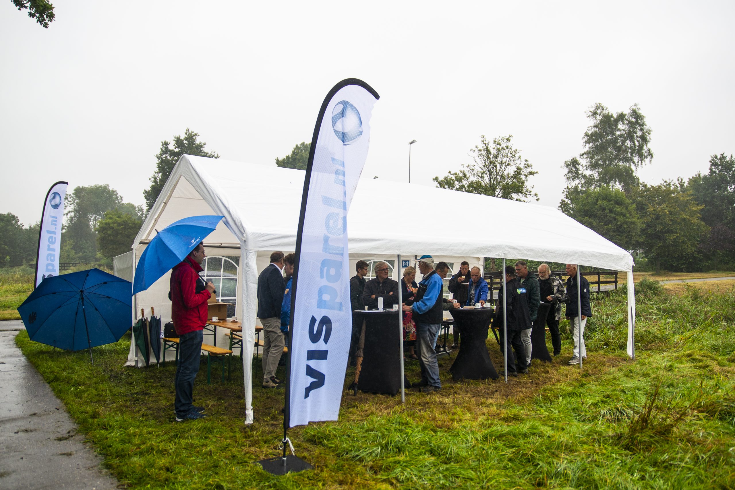 Om 16:30u heette ons bestuurslid, Sjors Hempenius, de genodigden van harte welkom. Vervolgens hield de wethouder van gemeente Noardeast-Fryslân een mooi woord over de sportvisserij binnen de gemeente Noardeast-Fryslân en de goede relatie met de lokale hengelsportverenigingen. Tot slot hield heemraad Otto van der Galiën een woord over het tot stand komen van de VISparels en een belangrijk onderdeel van de VISparels: het loodvrij vissen. Na het ondertekenen van de samenwerkingsovereenkomst was het tijd voor de onthulling en zo het symbolisch en officieel in gebruik nemen van de VISparels: Otto van der Galiën en Pytsje de Graaf visten de Sportvisserij Fryslân vlag van het VISparel bord af. Na afloop ontvingen de deelnemende partijen een mooi presentje als aandenken aan dit succesvolle project: een ‘spiegelkarperknuffel’ en een VISparelpuzzel; Het is vaak lang zoeken en passen, maar het resultaat is een prachtig geheel…