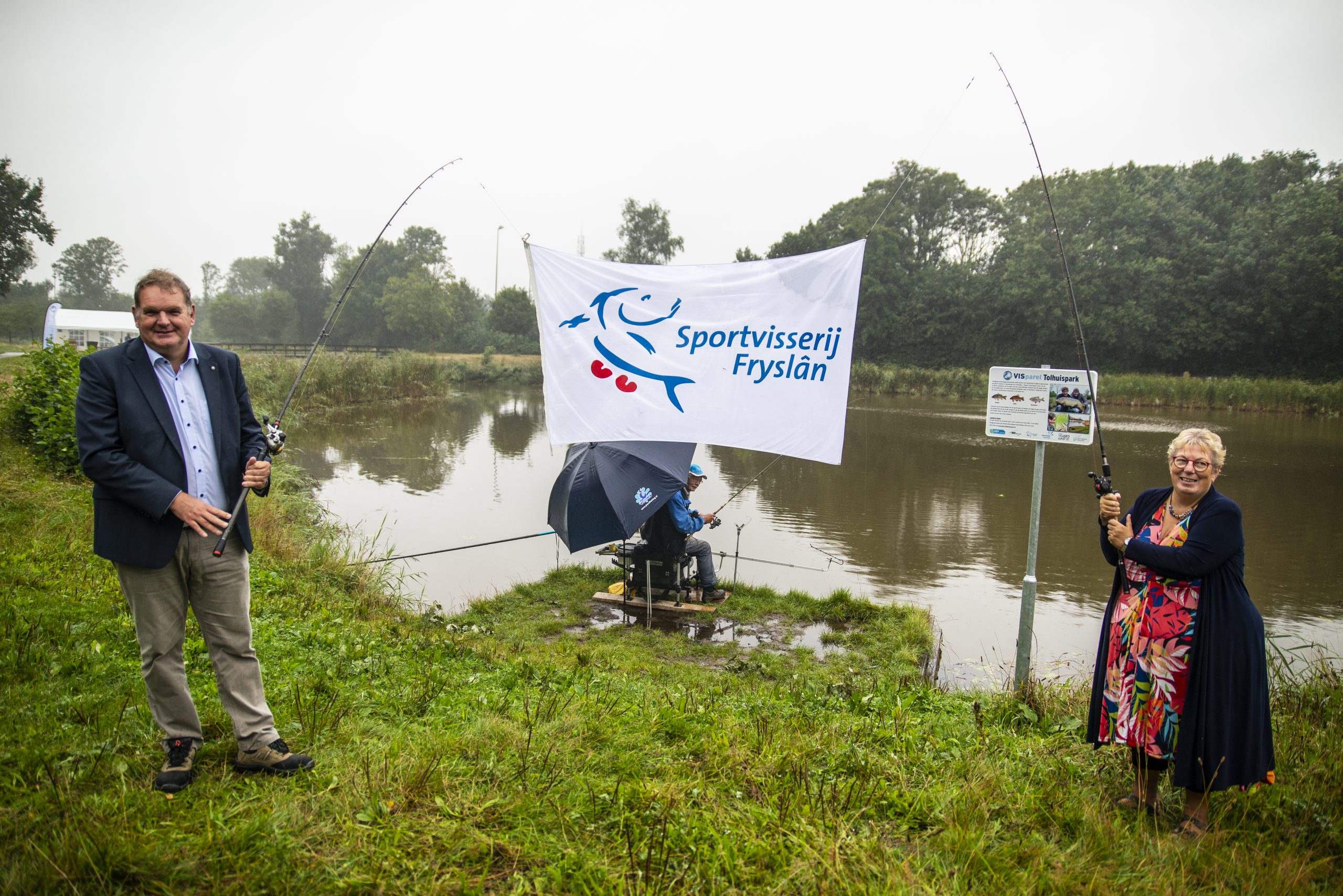 Heemraad Otto van der Galiën en Wethouder Pytsje de Graaf ‘vissen’ de vlag van het VISparelbord terwijl Arjen Antonisse zit te vissen.