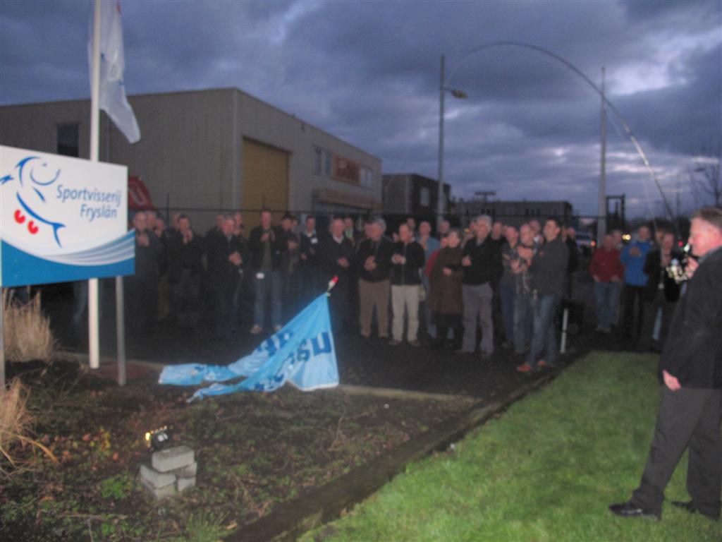 Na een korte speech van voorzitter Sake van der Meer werd het gezelschap van ca 70 personen mee naar buiten genomen. Na een eerste losschieter lukte het de voorzitter om het doek van het tuinbord te vissen en daarmee was de nieuwe naam en het logo onthuld. Vervolgens keerden de afgevaardigden van de Hengelsportverenigingen, Toezichtskringen, Wetterskip Fryslan, Vrijwilligers en andere relaties weer terug naar de warmte. Bij het verlaten van de receptie ontving een ieder nog een toepasselijke attentie.