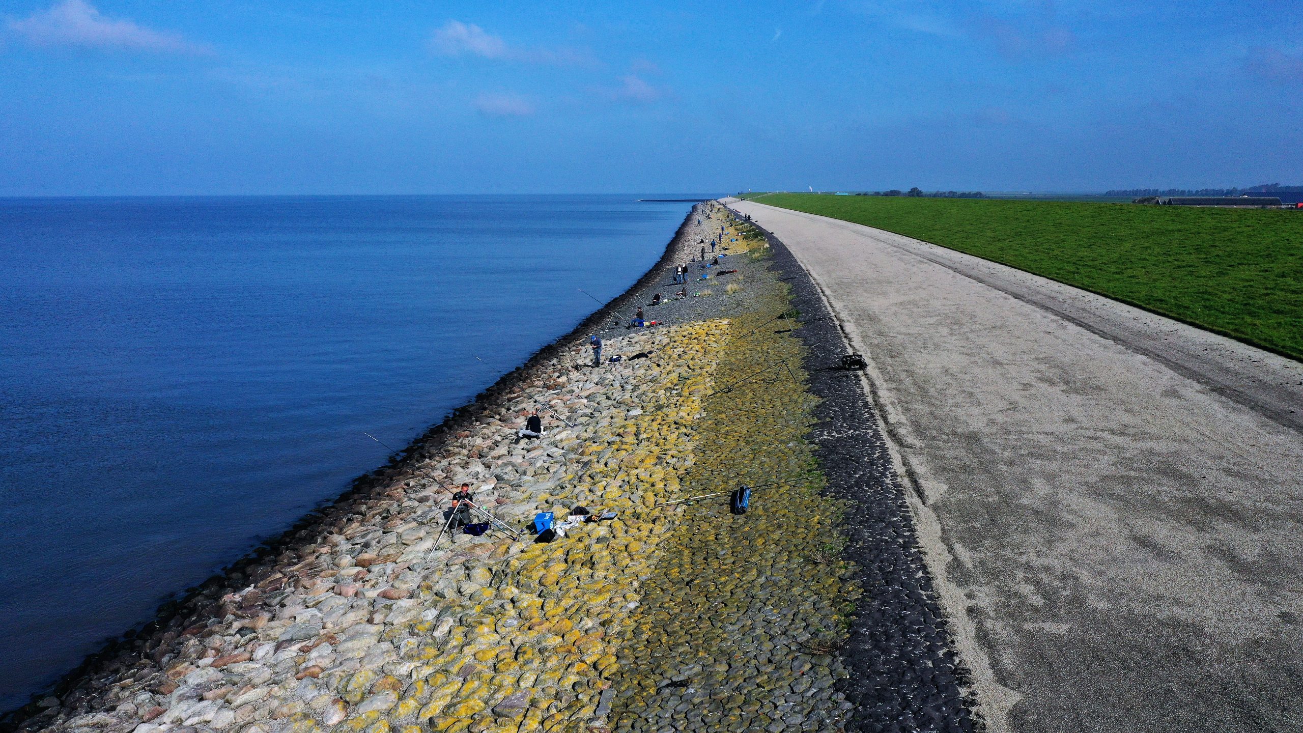 Om negen uur ’s ochtends verzamelden de sportvissers zich bij het gemaal van Roptazijl. Zoals gewoonlijk hing er weer een erg gezellige sfeer. Onder het genot van een bak koffie en een stuk cake kregen alle deelnemers hun visstek toegewezen. Na het welkomswoord en een korte uitleg over de wedstrijd vertrok een ieder richting de andere zijde van de waterkering. In de dichte mist troffen de zeevissers hun voorbereidingen waarna om elf uur luid getoeterd werd: de wedstrijd is begonnen!