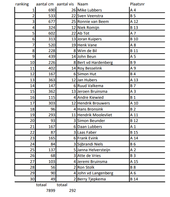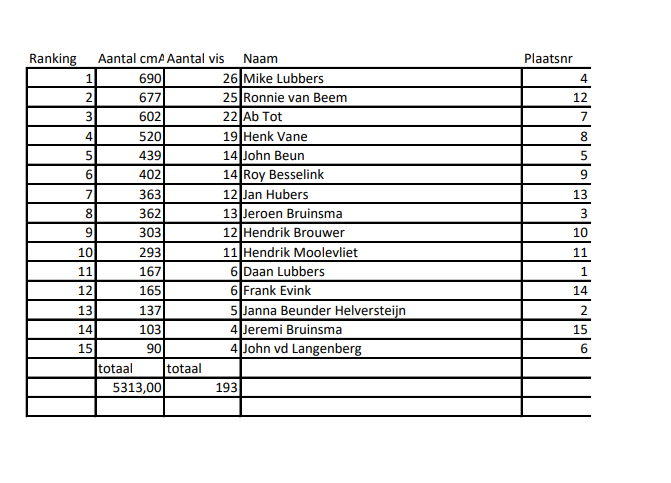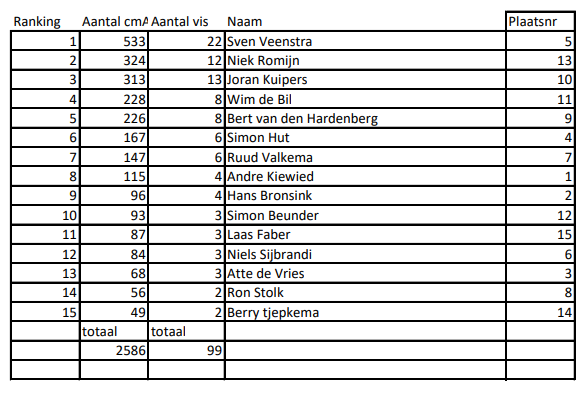 Ondanks het ruige weer kon de wedstrijd gelukkig doorgaan. Er werd bovendien aardig wat vis gevangen voornamelijk schar, bot en wijting. De deelnemers visten tot 14:00 uur, waarna ze konden genieten van een heerlijke kop snert in De Harmonie. Daar vond aansluitend ook de prijsuitreiking plaats.