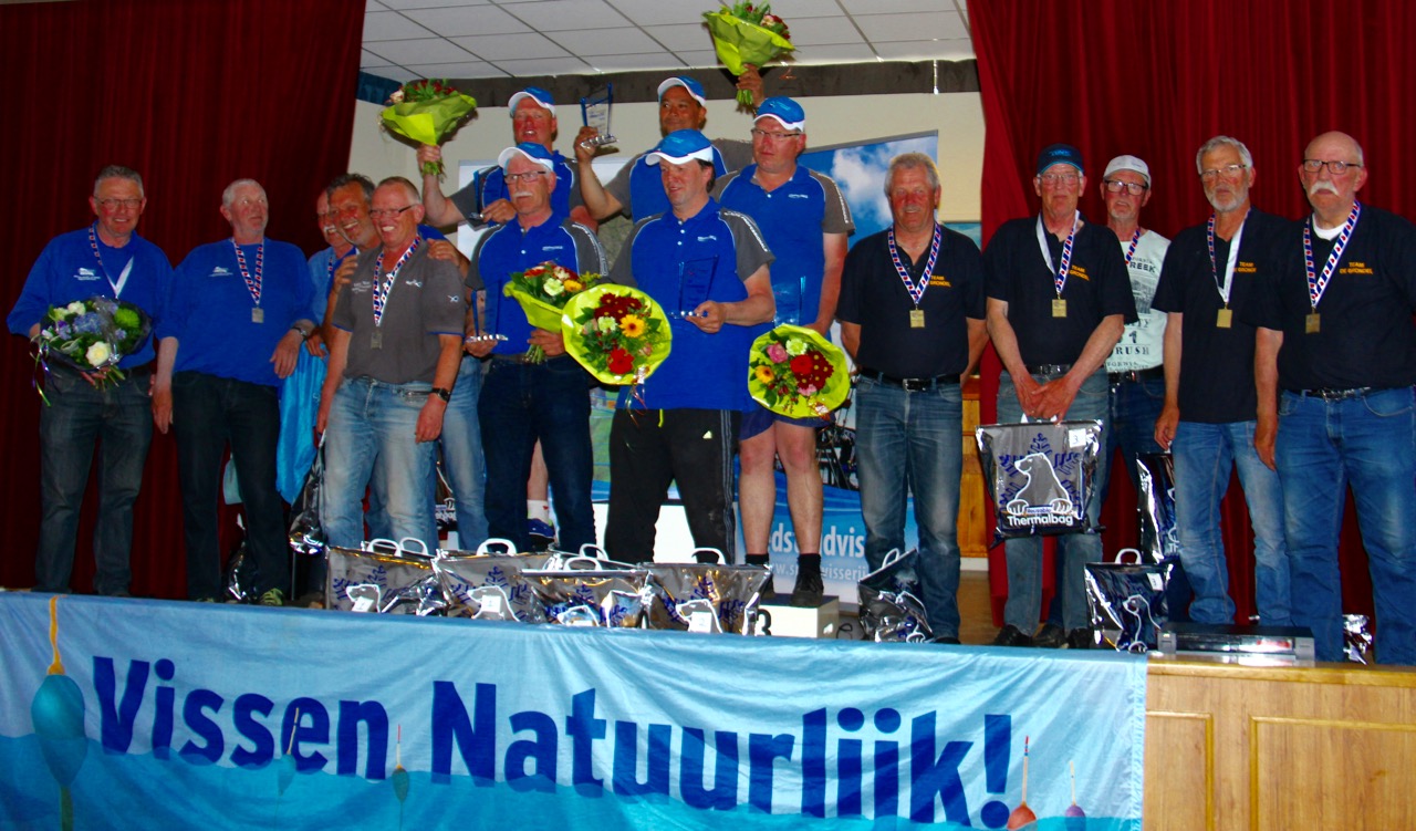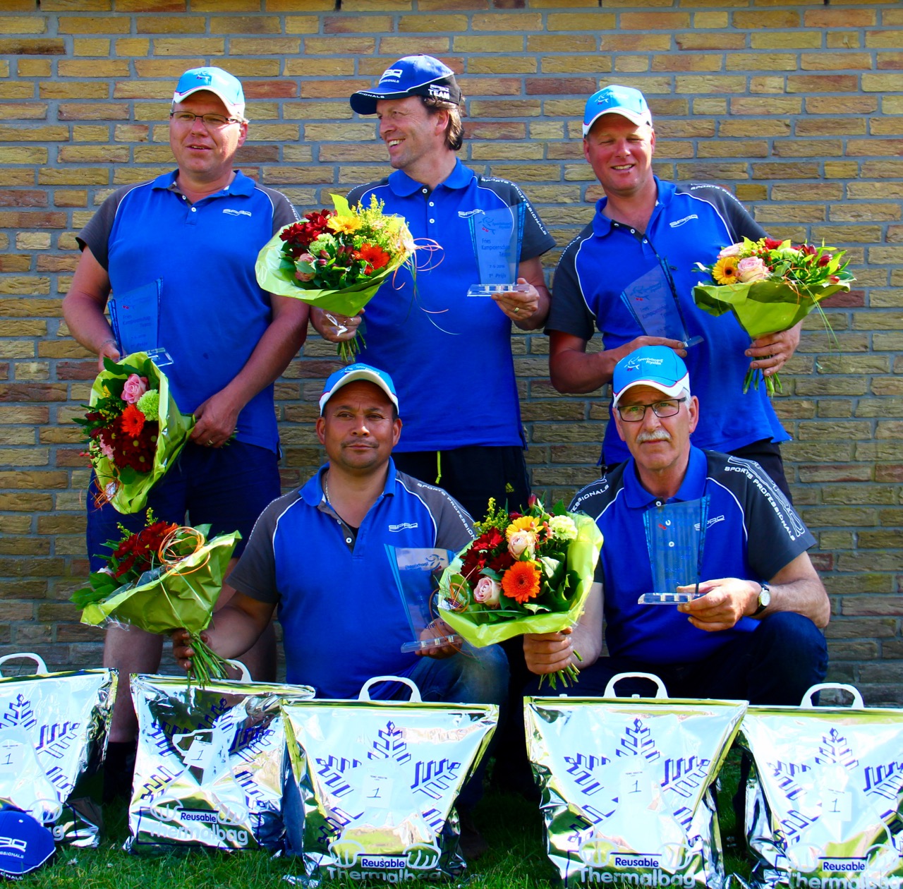 De scheidende voorzitter van Sportvisserij Fryslân, Sake van der Meer (uiterst links op de foto), verzorgde de prijsuitreiking en mocht zichzelf de tweede prijs uitreiken als lid van het Rietvoorn 3 team.