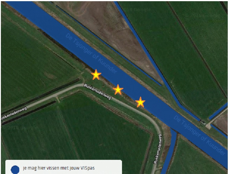 De steigers liggen aan de Ruskemadeweg op de onderstaande afbeelding aangegeven locaties. Alle VISpashouders mogen gebruik maken van deze steigers aangezien ook dit water (zoals 99,9% van de Friese wateren) ingebracht is in de Gezamenlijke Lijst van Viswateren.