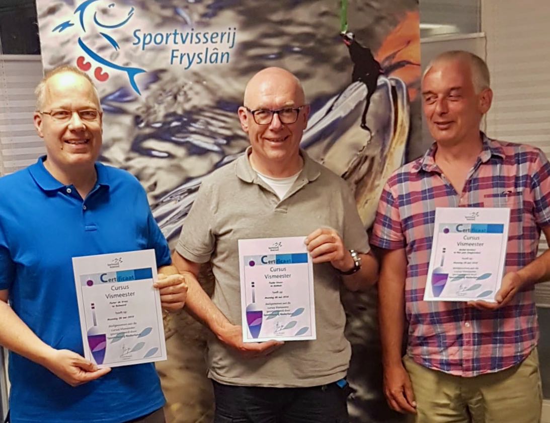 De heren tonen vol trots hun juist gehaald diploma na afloop van de cursus Vismeester.