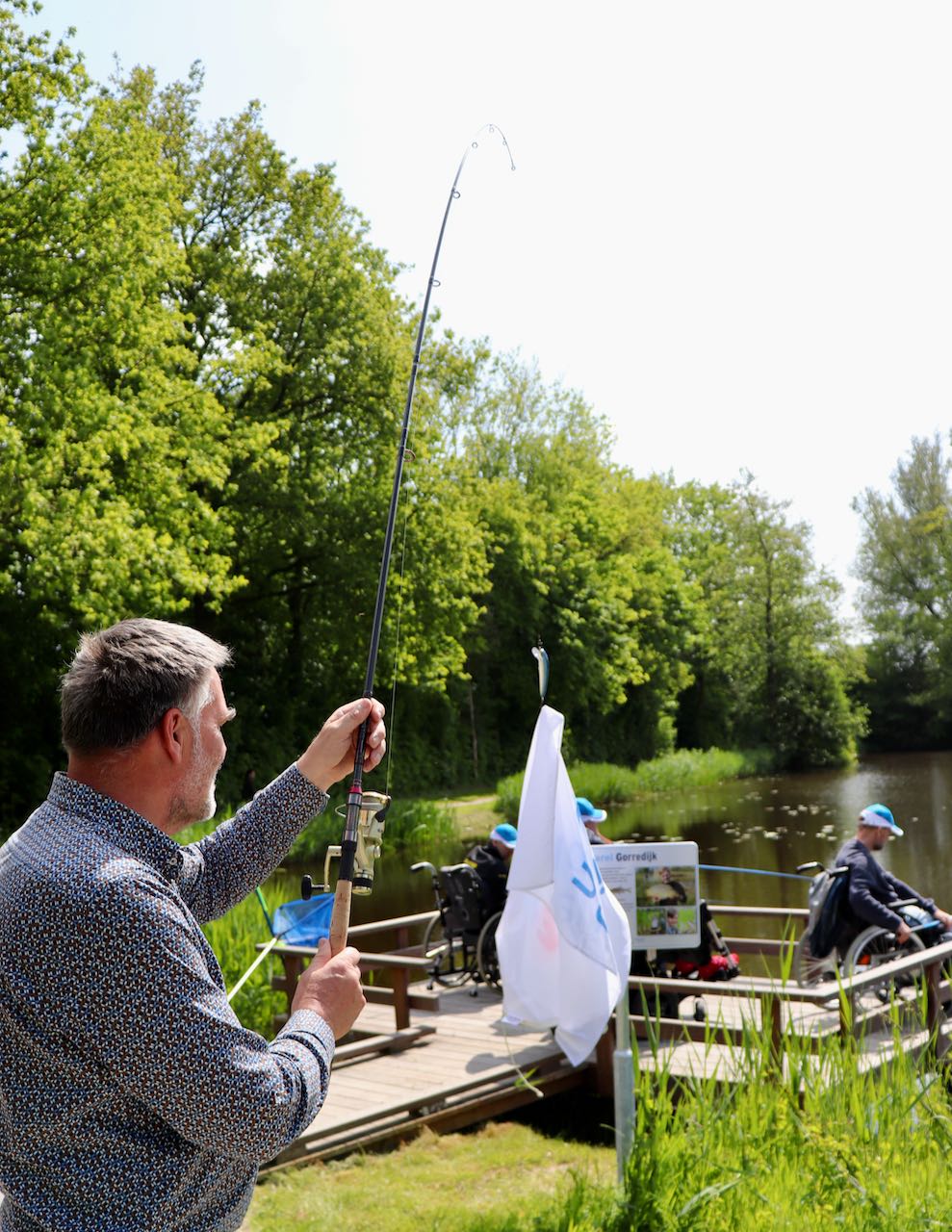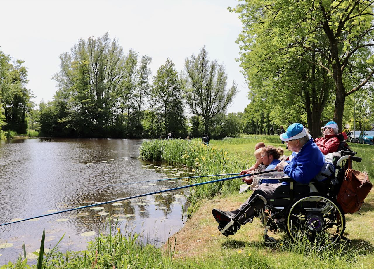 Ondertussen waren een zestal bewoners van ZuidOost Zorg Instelling ‘Iekenhiem’, vanaf de nieuwe steigers heerlijk aan het vissen onder begeleiding van vrijwilligers Jan, Peter en Ate van Sportvisserij Fryslân.