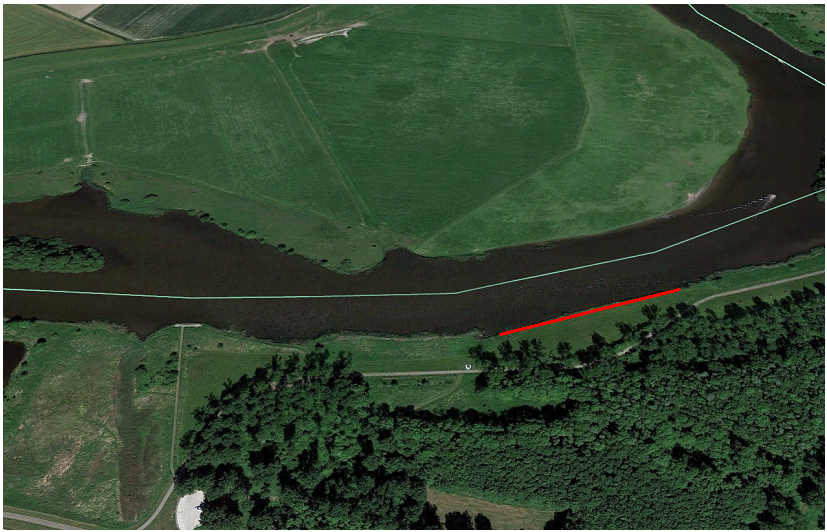 Op het kaartje hieronder wordt de – nu ook bevisbare – oever met een rode lijn aangegeven.