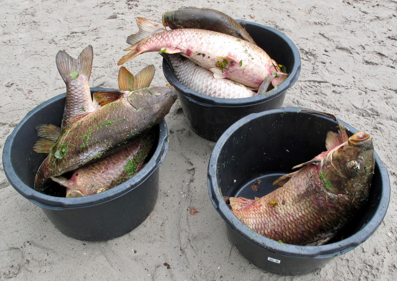 Door een trieste samenloop van omstandigheden is het zuurstofgehalte in de poel onder het levensvatbare niveau gedaald waardoor zeer veel vissen het niet hebben overleefd. Naar schatting 450 kg ( meer dan 20 speciekubs) dode vis is deze dagen afgevoerd.