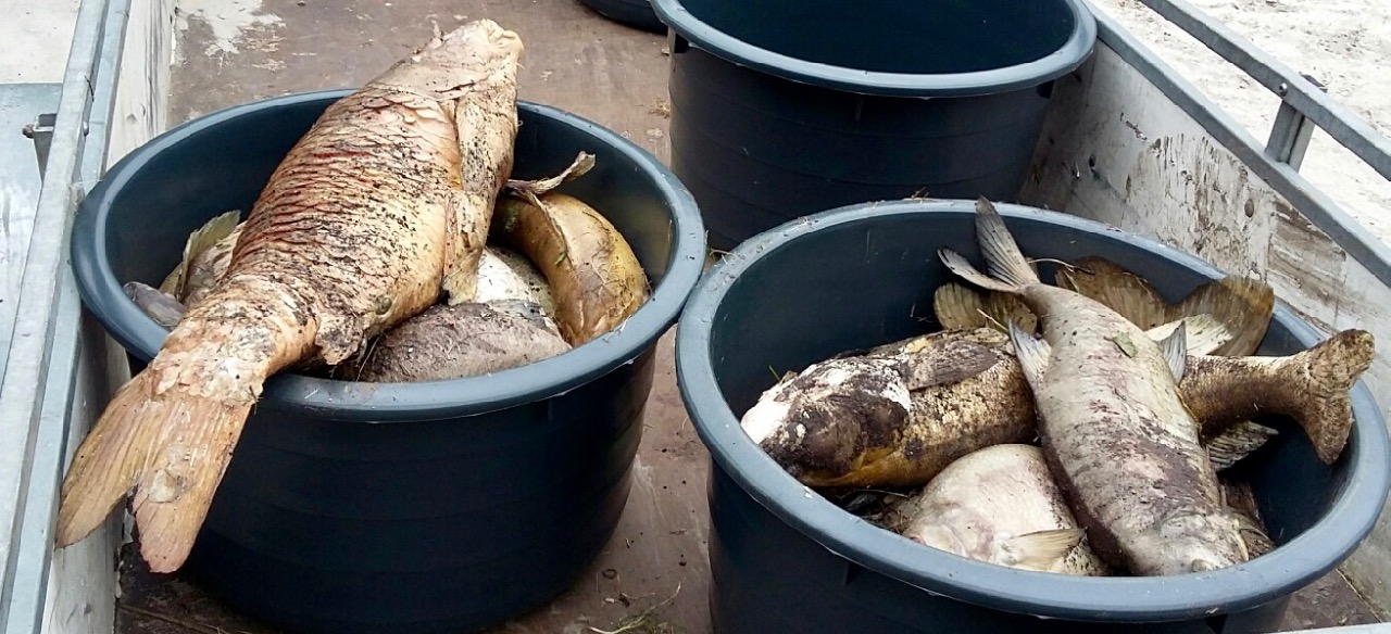 Door een trieste samenloop van omstandigheden is het zuurstofgehalte in de poel onder het levensvatbare niveau gedaald waardoor zeer veel vissen het niet hebben overleefd. Naar schatting 450 kg ( meer dan 20 speciekubs) dode vis is deze dagen afgevoerd.