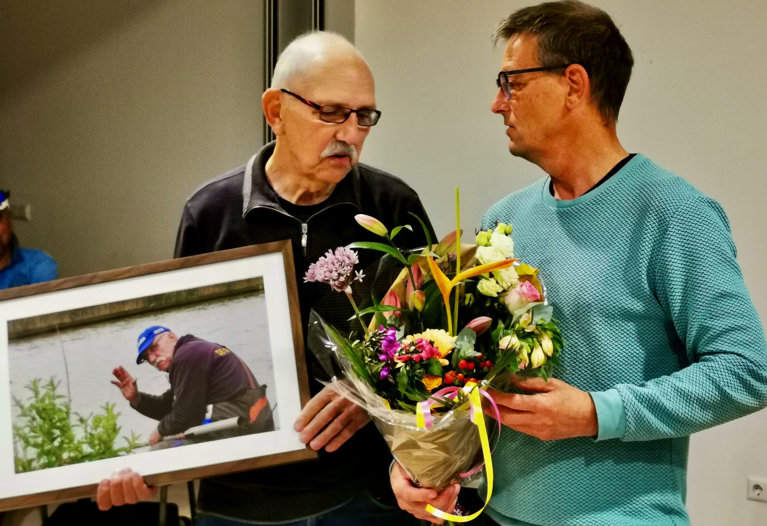 Henk krijgt de foto en bos bloemen uitgereikt door Pyt (Sportvisserij Fryslân)