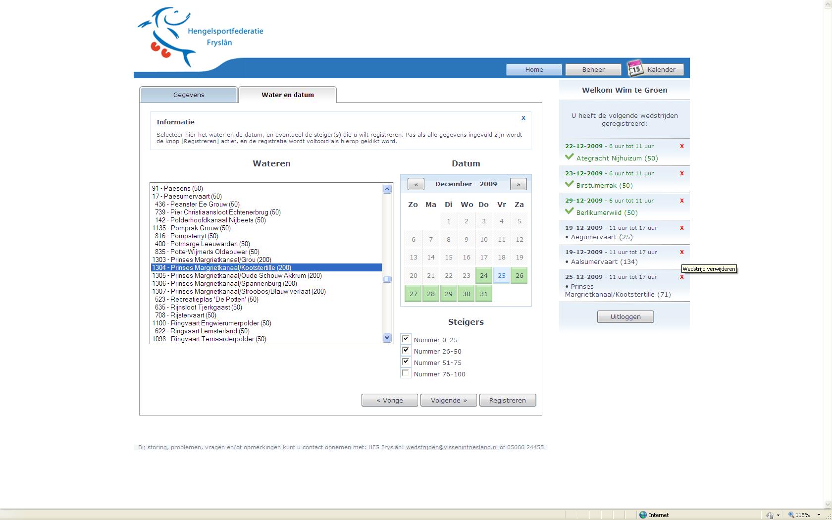 1. U kunt maximaal voor een wedstrijd twee wateren/locaties registreren.