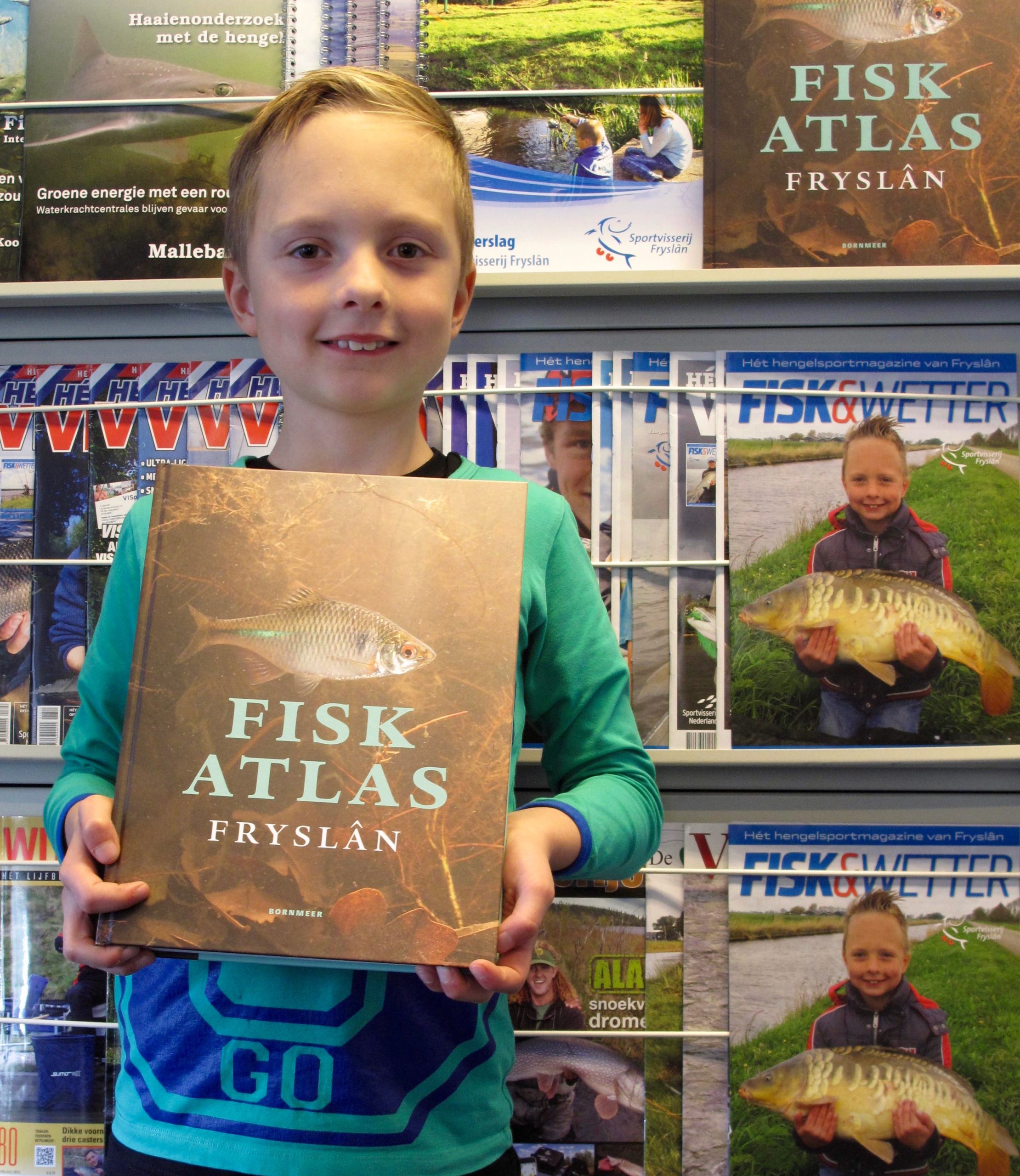 Bij de foto: Hidde Baarsma toont trots de zojuist ontvangen ‘FiskAtlas van Fryslân’ . Naast hem staat het Friese Hengelsportblad ‘Fisk&Wetter’ waarop hij met een prachtige spiegelkarper staat afgebeeld.